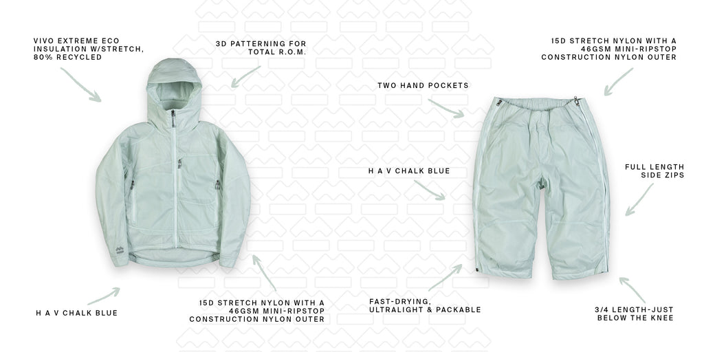 The outer fabric is a made in Japan, 15d stretch nylon with a 46gsm mini-ripstop construction. The insulation is paneled with recycled Vivo Extreme (40g) and Vivo Ocean (25g).